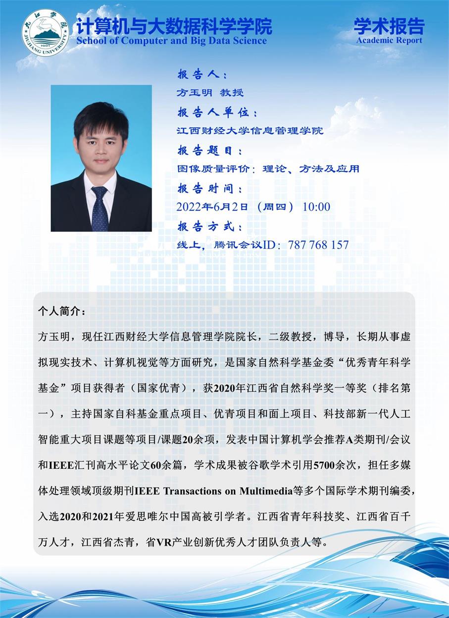 方玉明,现任江西财经大学信息管理学院院长,二级教授,博导,长期从事虚拟现实技术、计算机视觉等方面研究,是国家自然科学基金委“优秀青年科学基金”项目获得者(国家优青),获2020年江西省自然科学奖- -等奖(排名第一),主持国家自科基金重点项目、优青项目和面上项目、科技部新一代人工智能重大项目课题等项目/课题20余项,发表中国计算机学会推荐A类期刊/会议和IEE汇刊高水平论文60余篇,学术成果被谷歌学术引用5700余次,担任多媒体处理领域顶级期刊IEEE Transactions on Multimedia等多个国际学术期刊编委,入选2020和2021年爱思唯尔中国高被引学者。江西省青年科技奖、江西省百千万人才,江西省杰青,省VR产业创新优秀人才团队负责人等。