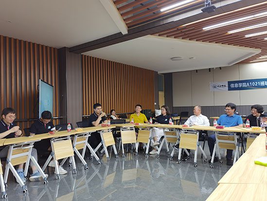 上午,同学们陆续来到学校文友楼门前集合,许久未见的同学们热情拥抱,互相问候。中午饭后,所有同学统一班服,来到了电子信息楼6楼会议室,参加了一场特殊的“班会”——与学院领导和老师们座谈。计算机学院院长邓安远、副院长彭虎和班主任老师朱娟、辅导员杨学风以及部分任课老师莅临现场,与同学们亲切交流,再叙师生情谊。因憾未能到场的同学也通过现场连线的形式参加了座谈会。