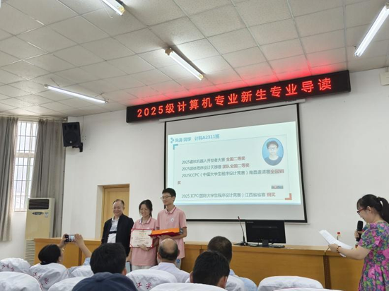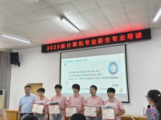 专业导读教育活动中,院长邓安远、党委书记邹国辉、副院长董西伟为2025年学科竞赛成绩优异的学生颁奖。颁奖仪式让整个专业导读活动从“被动听讲”变为“主动向往”,它用最直观的方式回答了新生心中最迷茫的问题:“我的大学应该怎么过?我的专业未来能做什么?”这为他们的大学生涯树立了学习榜样。