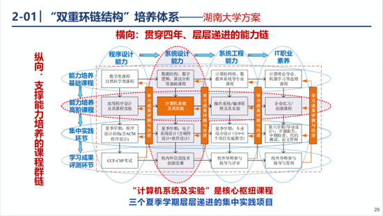 后续培训中,赵欢教授团队分享的湖南大学“计算机类核心课程贯通式培养体系”,体现了课程改革的“可行解”。“双重环链结构”设计尤为亮眼:横向以“程序设计能力-系统设计能力-系统工程能力”为递进目标,串联四年课程形成“能力培养链”;纵向以“计算机系统”为枢纽课程,打通数字电路、操作系统、编译原理等课程壁垒,构建“课程群支撑链”。这种设计避免了知识碎片化,使得学生每阶段的学习都有明确的能力目标指向。