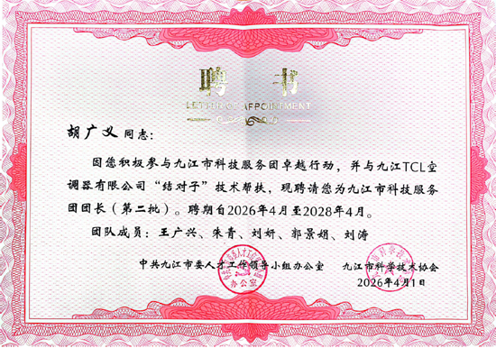 4月9日,2026年九江市科技服务团卓越行动工作部署会在九江市市民服务中心召开,会上正式公布第二批科技服务团组建名单并颁发聘书。yl23411集团计算机学院工博士科技服务团成功入选。yl23411集团计算机学院工博士科技服务团将以九江TCL空调器有限公司为核心服务对象,依托前期视觉检测项目合作基础,聚焦家电智能制造数字化升级,为九江电子电器产业高质量发展注入新动能。