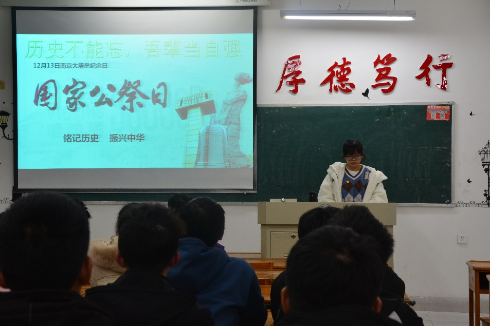 为纪念南京大屠杀遇难同胞,加强我院广大学子的爱国主义教育,12月15日晚,计算机学院于文友楼各班教室开展“历史不能忘,吾辈当自强”主题团日活动,此次活动由各班团支书主持,全体大一学生参加。
