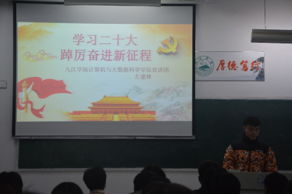 为深入学习贯彻党的二十大精神,引导我院学生切实把思想和行动统一到党的二十大精神上来,把智慧和力量凝聚到完成党的二十大确定的各项任务上来,更好团结引领我院学生紧跟党奋进新征程、夺取新胜利。计算机学院于11月8号在文友楼514开展“学习二十大•踔厉奋进新征程”宣讲活动,宣讲人为团委学生副书记左建林,计算机学院全体团委学生会干部参会。
