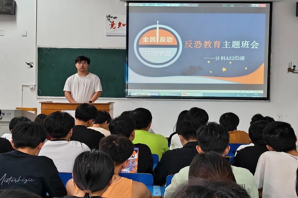 开展反恐防暴反邪主题班会。主题班会上,各班通过观看视频全面介绍了反恐防暴反邪形势与案例分析、法律法规宣传、知识技能培训以及反恐防暴反邪意识培养与责任担当。各班班长深入刨析了国内外反恐防暴反邪形势,让学生认识到反恐防暴反邪工作的重要性和紧迫性,鼓励学生树立主人翁意识,积极参与校园安全管理,关注国家大事,共同维护国家安全。