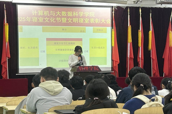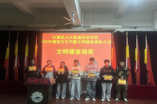 寝室文化节环节,同学们通过精心准备的寝室文化展示,生动呈现了寝室成员的精神风貌、整洁的内务环境以及丰富多彩的宿舍生活,尽显同学们的生活习惯与集体意识;室友间互帮互助、团结友爱的氛围,让每个宿舍都充满了家的温暖,展现了同学们对宿舍生活的热爱与用心。随后的表彰大会,对2024-2025学年第二学期的文明寝室以及寝室文化节中表现突出的十间寝室予以表彰,获奖寝室代表向同学们分享建设经验。