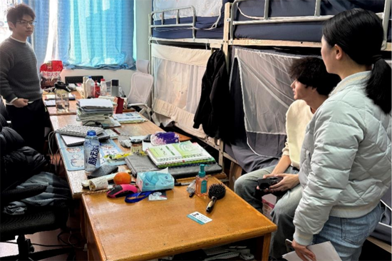排查过程中,重点对宿舍内违章电器使用、用电线路规范、消防安全通道畅通等情况进行全面细致检查,对发现的大功率吹风机、违规接线板等违章电器当场予以没收,同时对相关学生进行严肃的批评教育,告知他们违章电器的火灾隐患危害,强调宿舍安全是校园安全的重中之重。走访中,针对毕业班学生,老师们逐一了解学生的就业、考研进展,对正在求职的同学,鼓励同学们把握期末及寒假前的实习招聘黄金期,主动对接企业资源,优化简历、积极投递;对即将踏上考研考场的同学,送上暖心祝福,叮嘱大家调整心态、沉着应考;对于非毕业班学生,老师们重点强调“诚信迎考”的重要性,要求同学们严格遵守考试纪律,杜绝作弊行为,树立正确的学业观。
