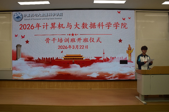 吴健豪宣读2026年骨干班一到六组成员名单,陈琴宣读2026年骨干班组长名单及考核制度,裘闽馨宣读骨干班活动具体安排。随后,骨干班新生代表A2552余学烽作表态发言,他承诺以饱满热情投身学习实践,主动践行并传播两会精神,以青春担当为集体贡献力量。